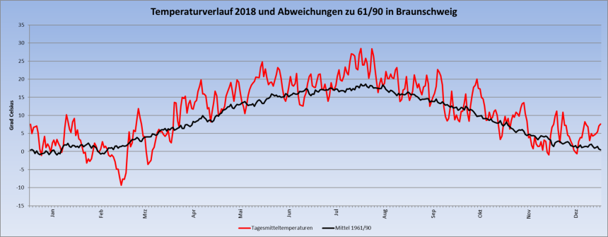 Das Jahr 2018 war ein wettertechnisch außergewöhnliches Jahr. Dafür hat die lang anhaltende Hitze, Trockenheit bzw. Dürre gesorgt. In Braunschweig ist die Temperatur oft weit oberhalb des langjährigen Mittels angesiedelt. Dies hatte zur Folge, das es hier in Braunschweig das wärmste Jahr seit Aufzeichnungsbeginn wurde!