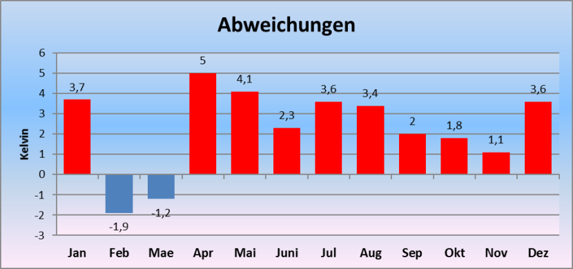 Zur besseren Übersicht zusätzlich eine Grafik mit den Monatsmittelwerten und deren Abweichungen zum langjährigen Mittel.