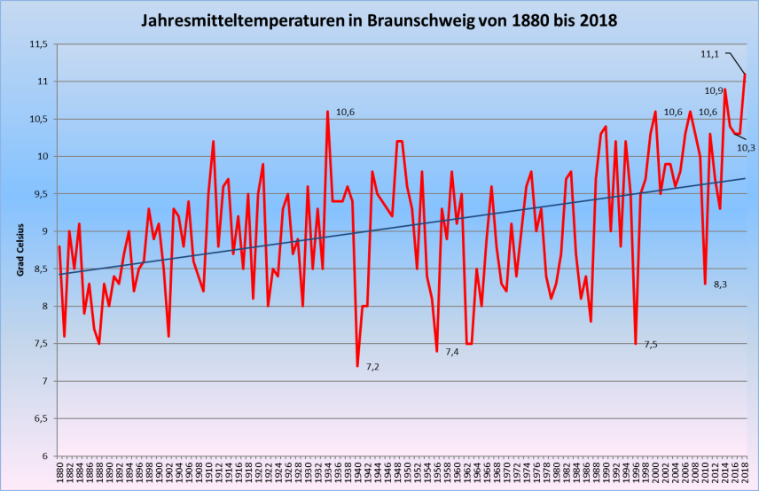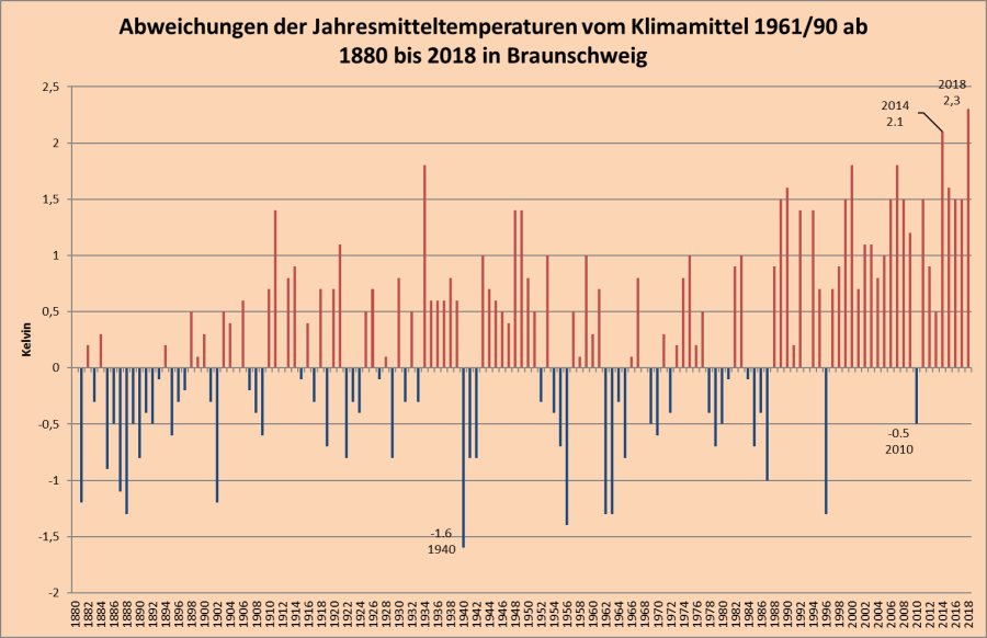 Temperaturen in Braunschweig 2018 und die Entwicklung seit 1891