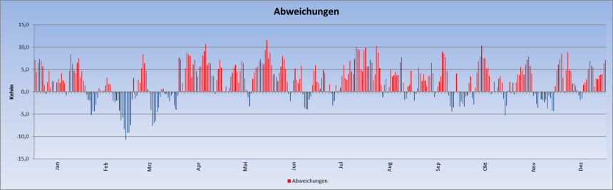 Sehr schön ist zu sehen wie viele Tage deutlich oberhalb des Mittels (schwarze Linie) liegen. Das ist wirklich extrem!